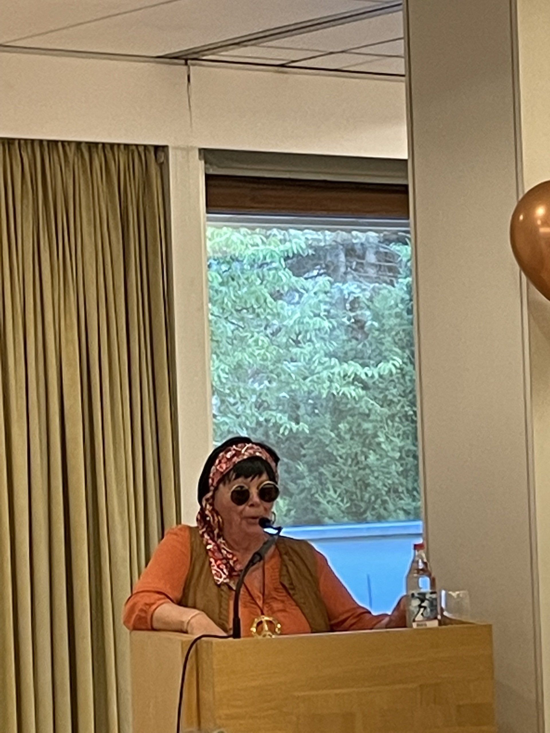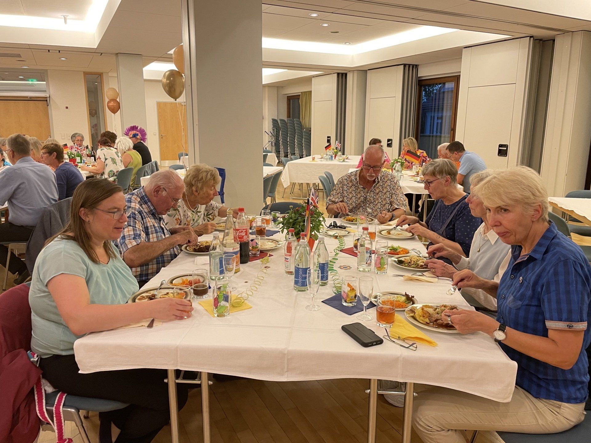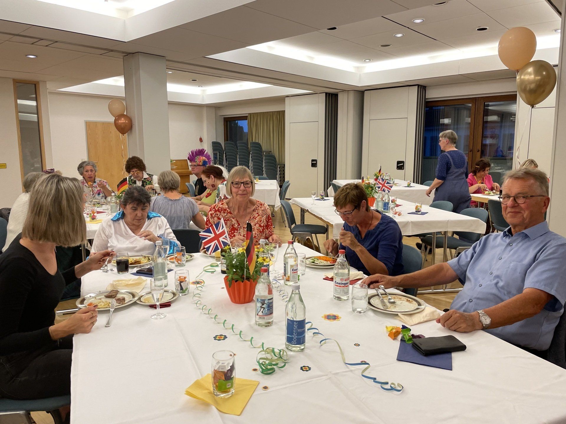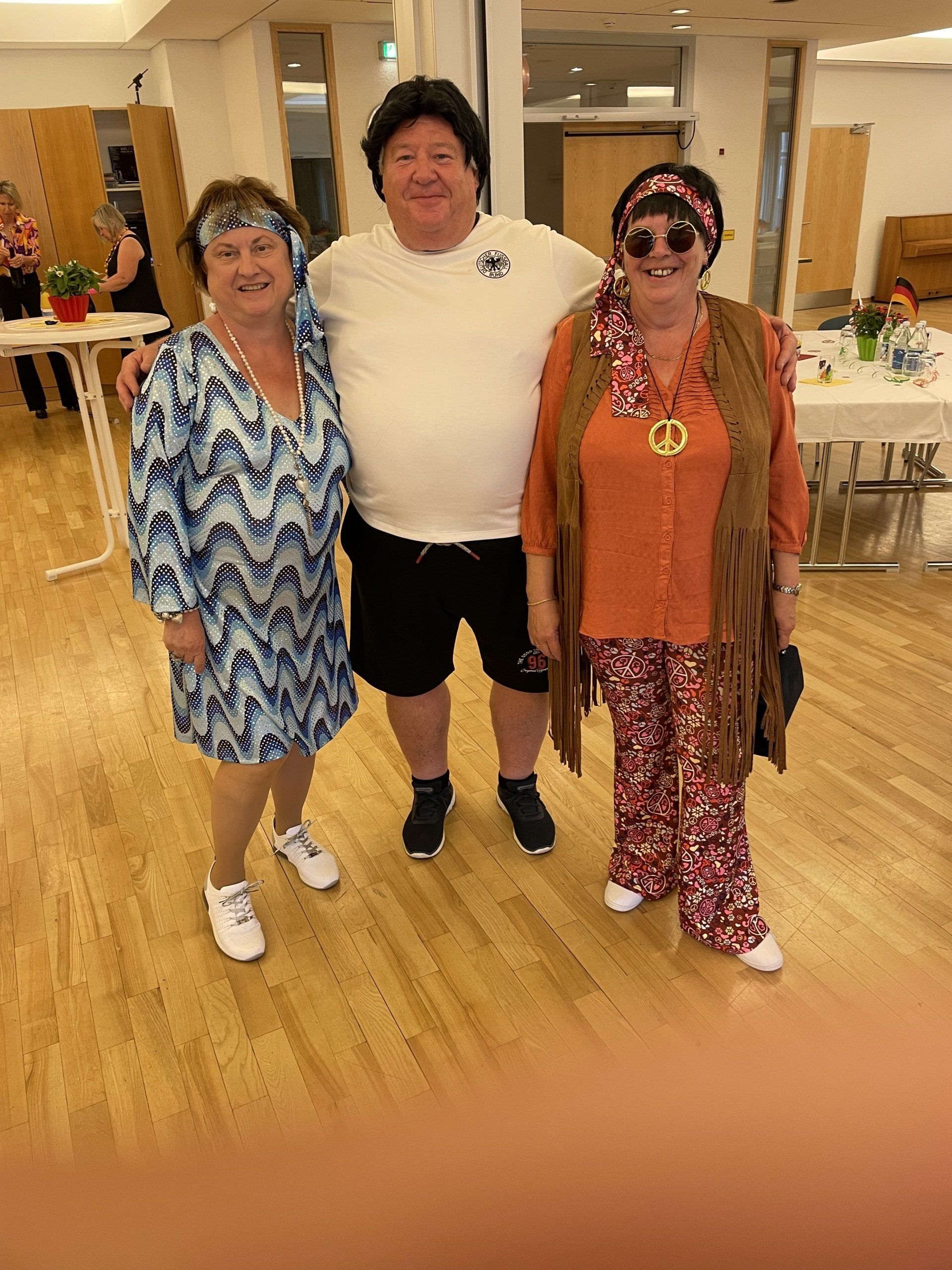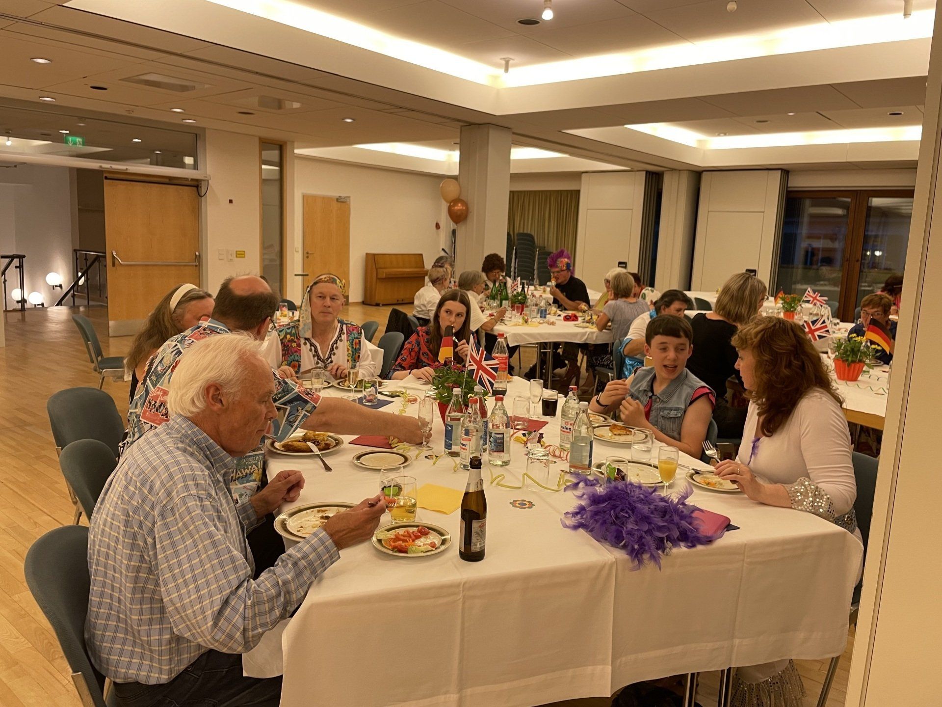 At evening was the encounter festival - organized by the city of Filderstadt on the occasion of the 20th anniversary. The motto was the 70s. It was great again what disguises the guests and hosts came up with. From the hippie to the dancing star to the goalscorer Gerd Müller, everything was there. The city had organized everything very well: very nice decoration, delicious buffet, speeches on the anniversary and a lecture on the history of the partnership. And finally there was a birthday cake with fireworks. And then the dancing leg was swung.