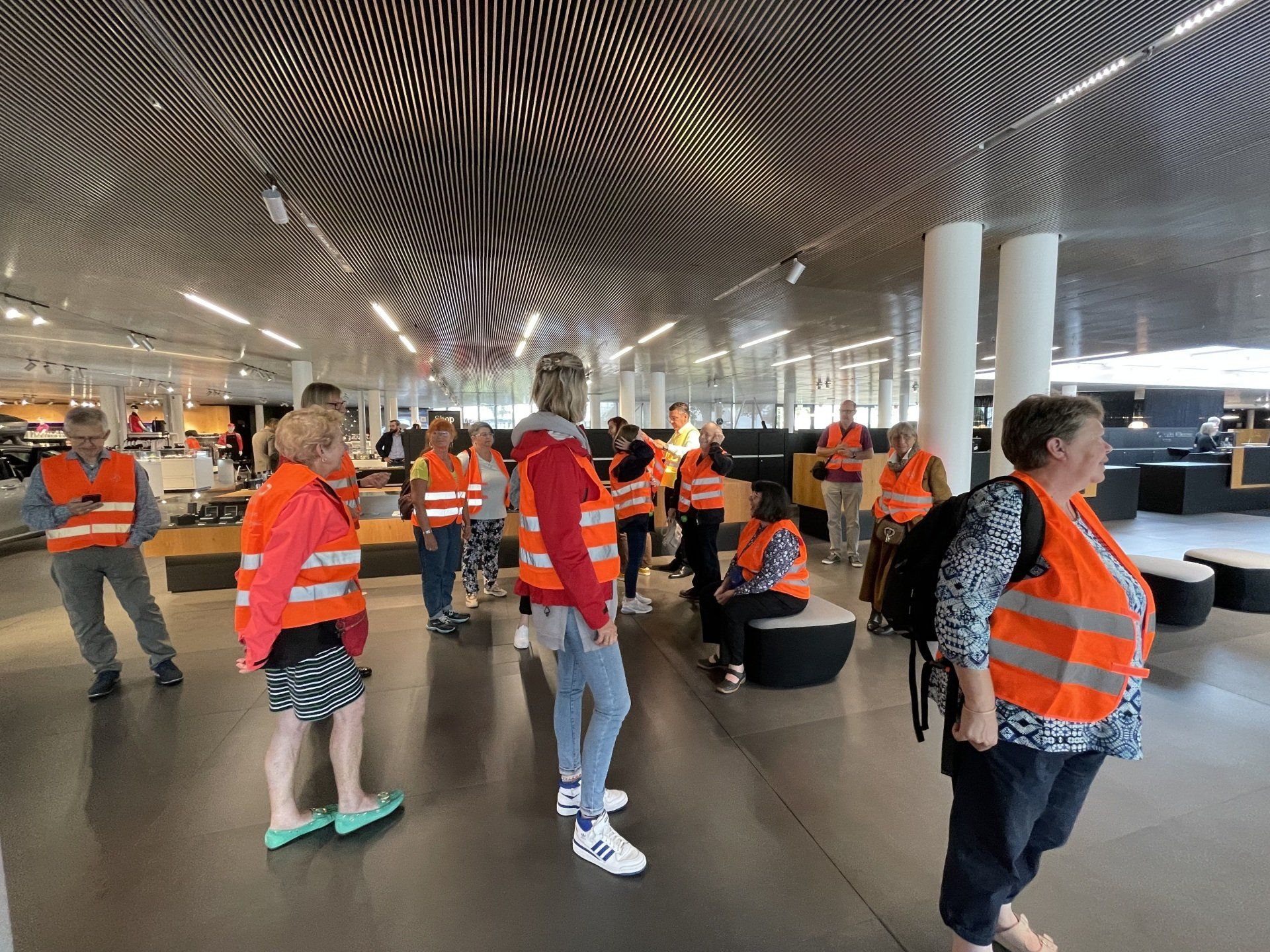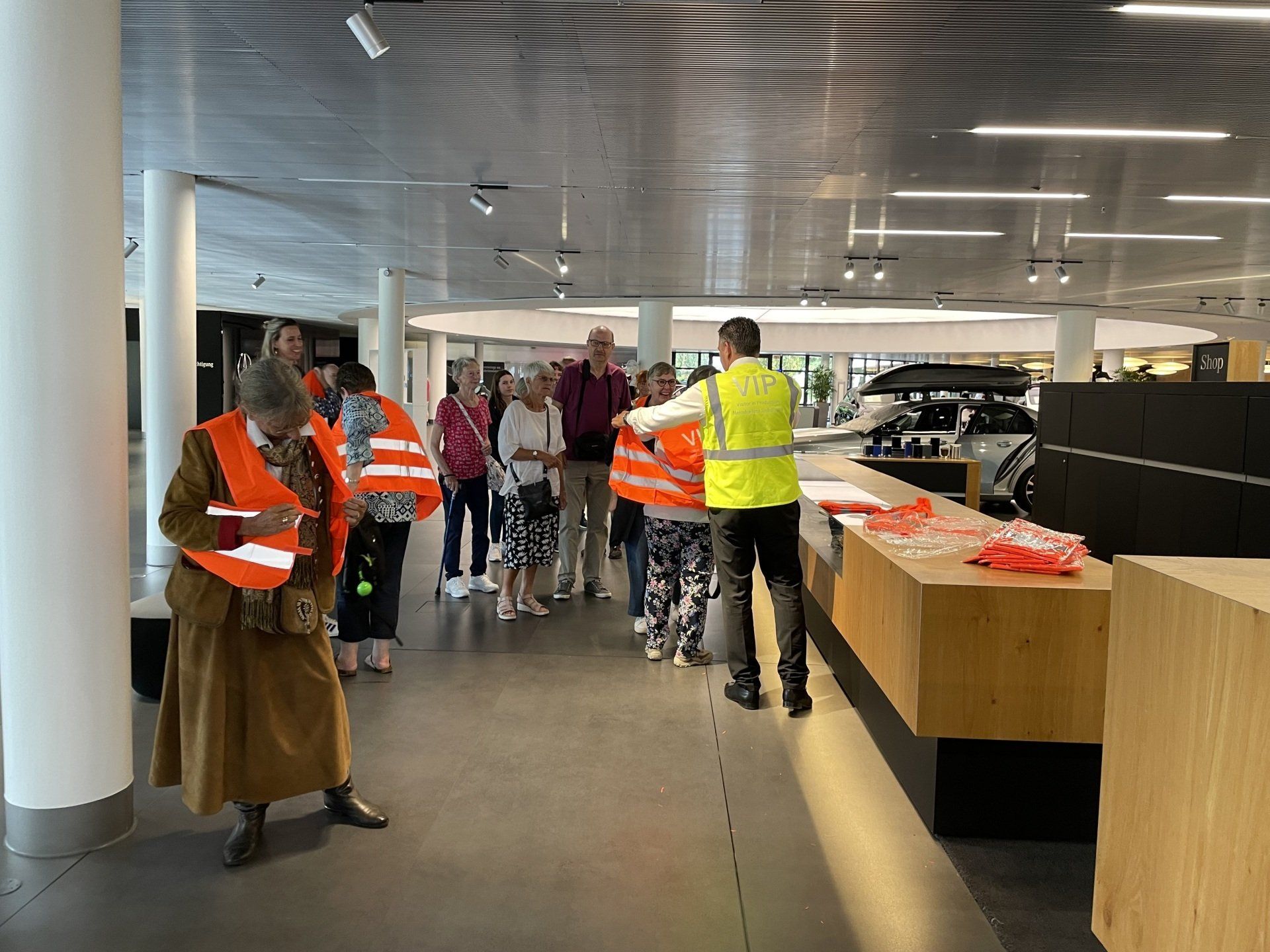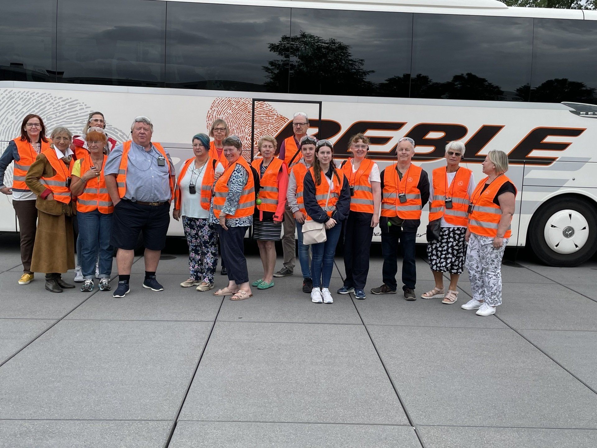 The first item on the agenda was the city tour of Sindelfingen by bus. The drizzle couldn't harm the cheerful group. This was also a premiere for many German hosts. Then there were packed lunches on the bus and we continued to the visitor center of the Daimler works in Sindelfingen. There we had to equip ourselves with warning vests and goggles. At the beginning was a short introductory film and then we were taken by bus to the factory buildings. First in the hall where workers still assemble the blanks for finished cars on the conveyor belt. And then to the production hall where only robots work. Everyone was very impressed with the factory's leadership and logistics of getting each part to the right place.