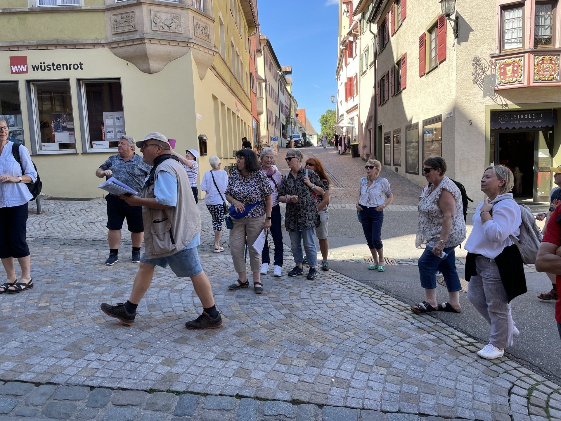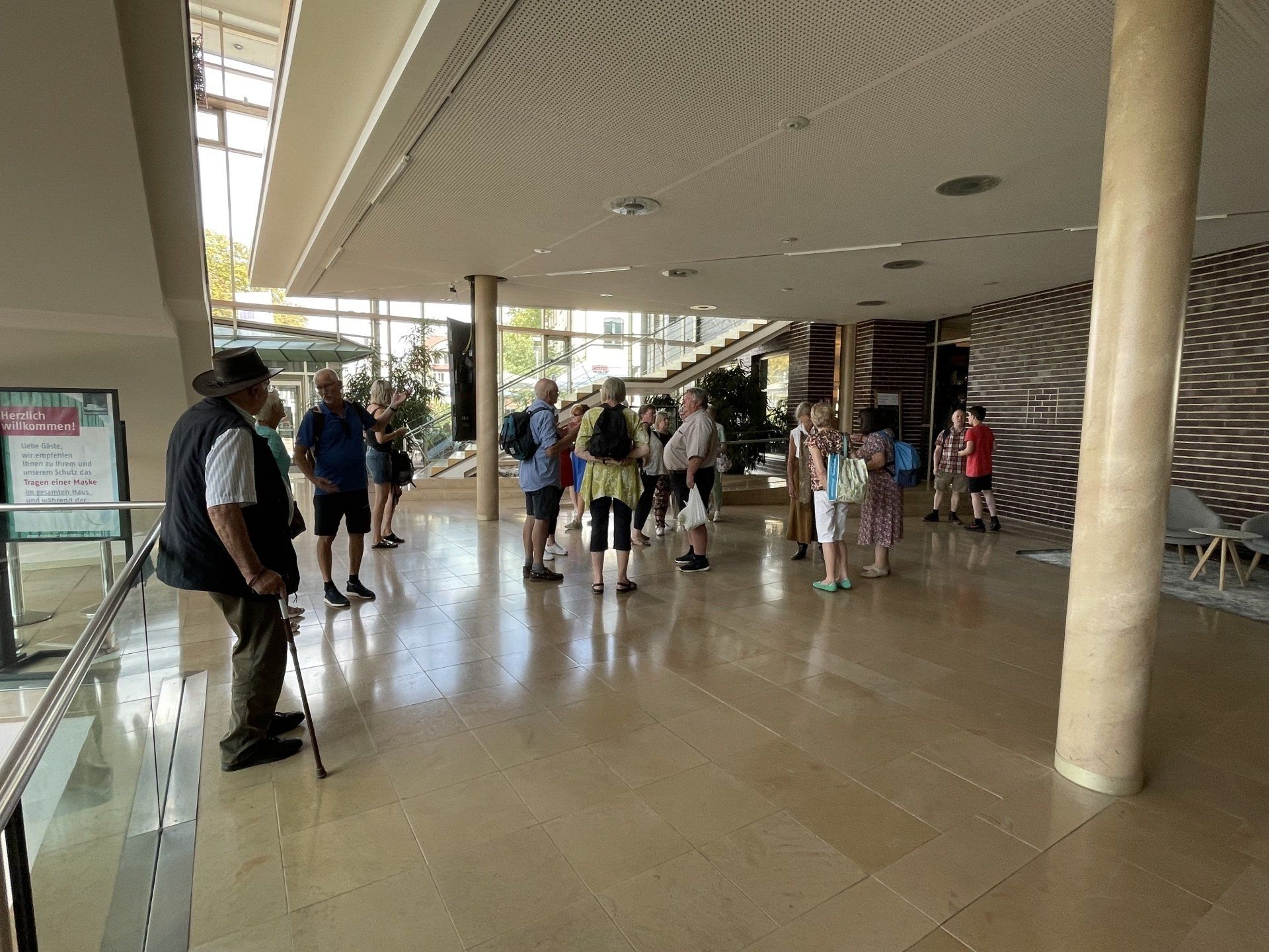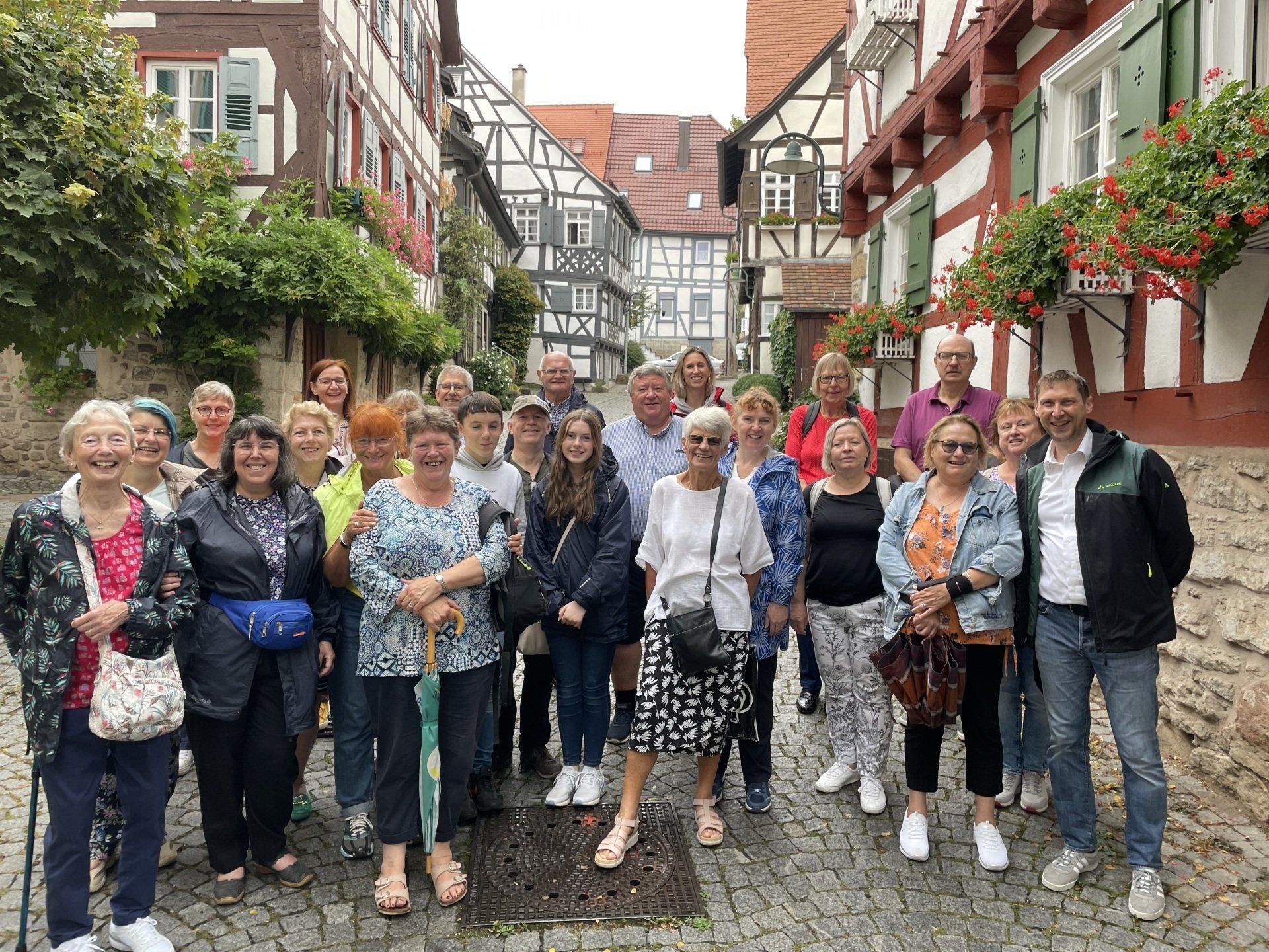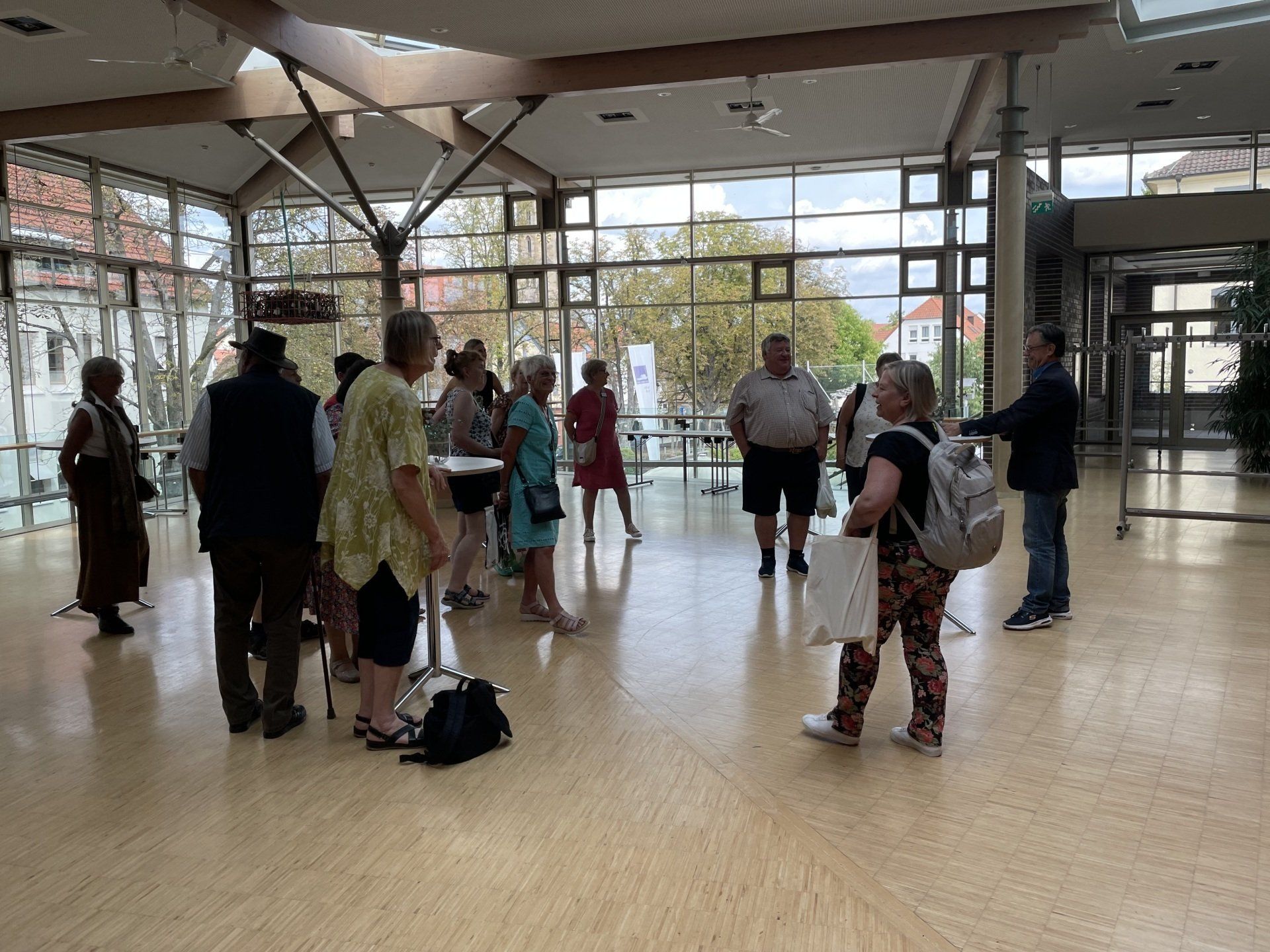 On the way to Schorndorf by public transport. That was an experience in itself - but after several changes, we finally arrived in Schorndorf. After the journey had lasted longer, we strolled around the market for a bit and then went to lunch in the restaurant in the Barbara-Künkelin-Halle. Sven Plug (formerly in the Filharmonie) is now responsible there for hall occupancy and other tasks. After the delicious meal, he spontaneously offered the group a tour of the hall. Then it was on to an interesting city tour through the streets of Schorndorf, ending at the birthplace of Gottlieb Daimler. Due to the very warm temperatures, the groups then spread out in cafes for a delicious drink or an ice cream. The journey home was then individual.